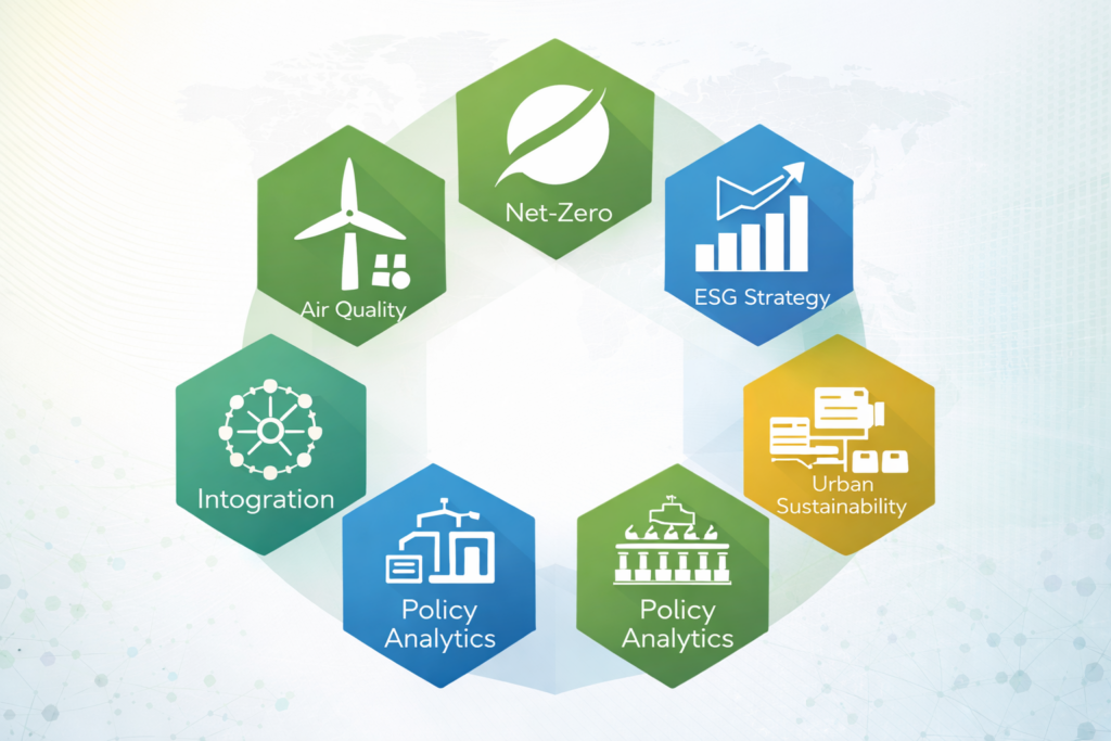 Core Domains: Our institutional expertise is structured across six critical thematic pillars: Air Quality, Net-Zero Intelligence, ESG Strategy, Climate Analytics, Urban Sustainability, and Policy Advisory.